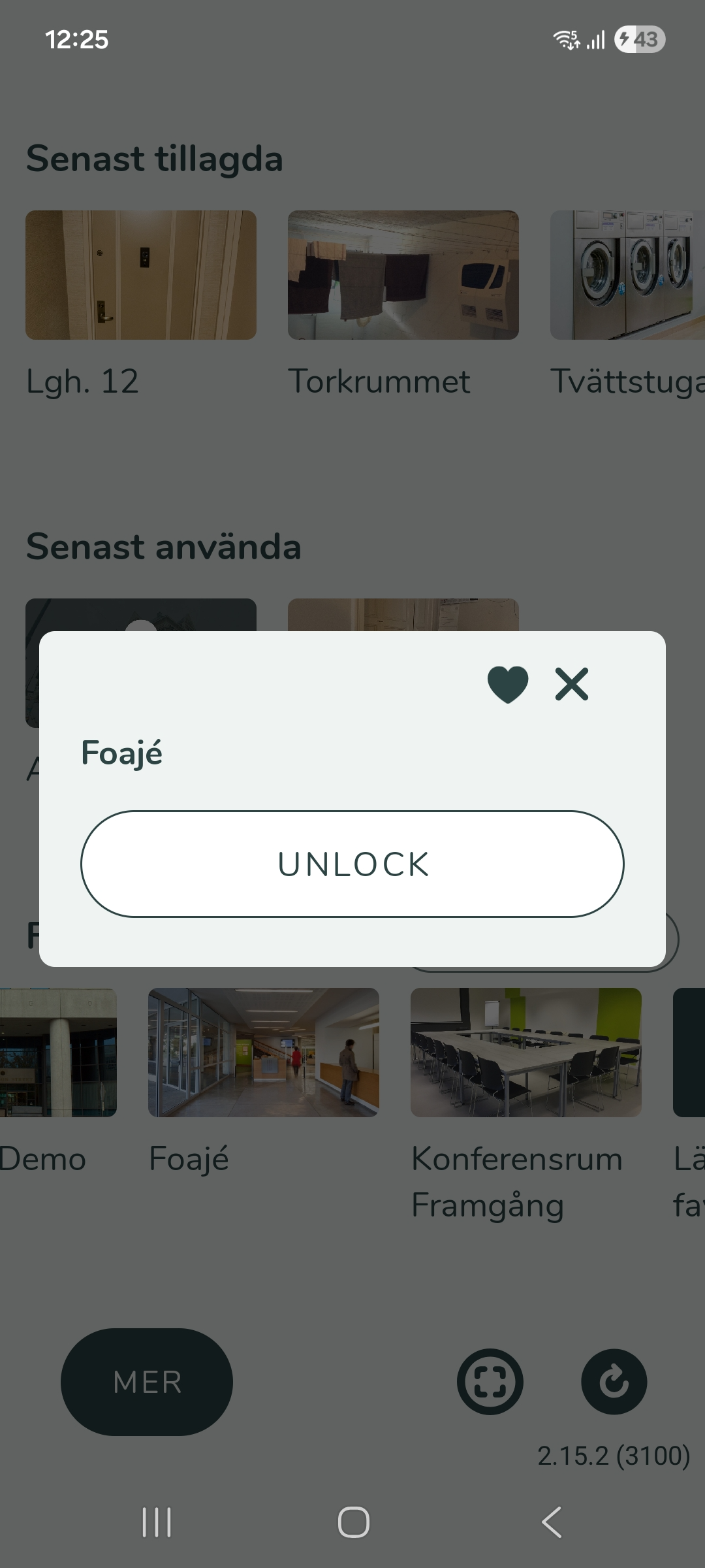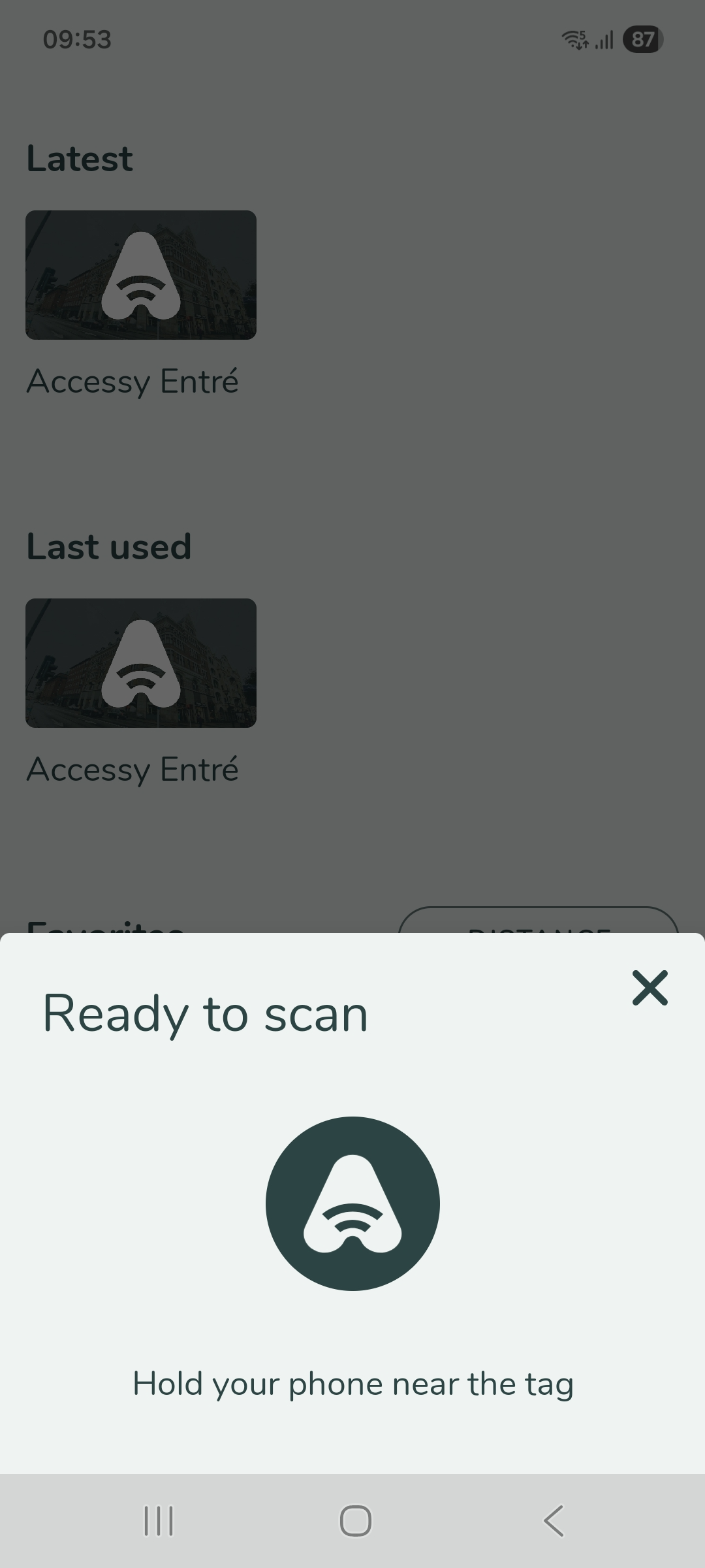 You can open doors either by scanning the “Accessy puck” at the door (if there is one), or by tapping the open button in the app. To scan, the app must be in “Ready to scan” mode by tapping the Accessy logo in the middle. The open button may have slightly different names, but is often called “Unlock” in most cases and looks like this: