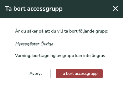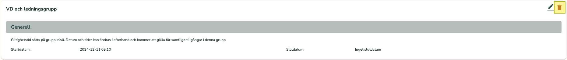 För att helt radera en accessgrupp, klicka först in dig på accessgruppen och klicka sedan på den röda papperskorgen i höger hörn: