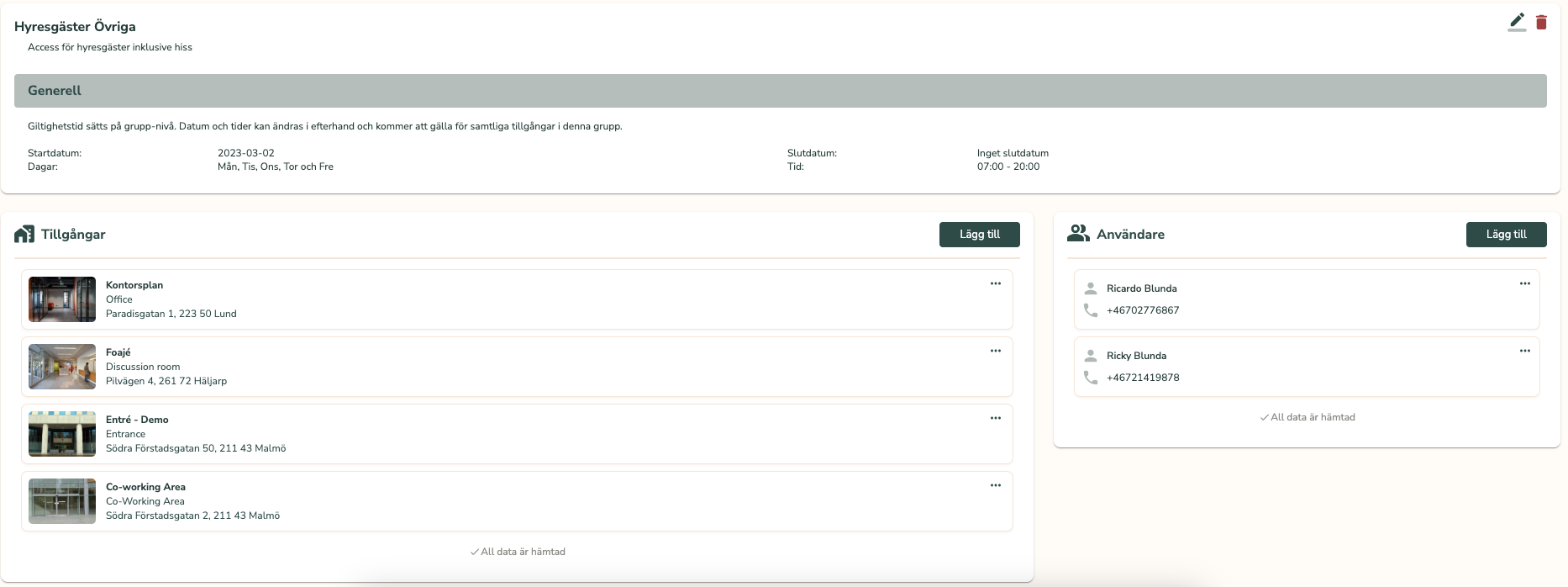 Under "Grupper" och "Accessgrupper" i menyn, kan du klicka på en accessgrupp i listan för att se vilka tillgångar den innehåller samt vilka användare som finns i accessgruppen. Du ser även giltighetstiden som gäller för accessgruppen. Giltighetstiden gäller för samtliga användare i gruppen och kan ej ställas in för individuella användare.