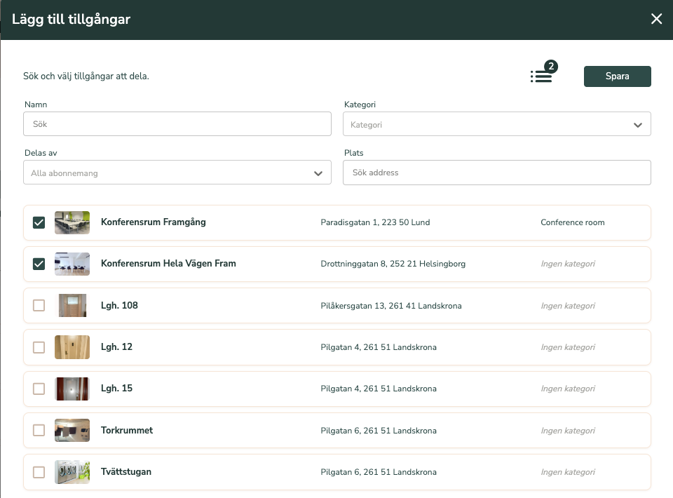 När du bockar i de tillgångar du vill ha, läggs de i "varukorgen" uppe till höger. Du kan med andra ord nu göra fler sökningar och lägga till fler tillgångar i samma veva. När du känner dig klar trycker du på "Spara".