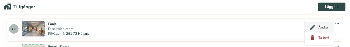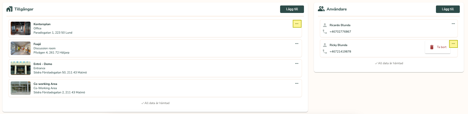 För att ta bort en användare eller tillgång, klicka på "de tre prickarna" i listan: