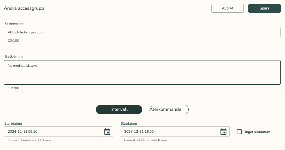 Om du istället för "Spara" har en knapp som heter "Nästa", innebär det att du har skapat en s.k. "Anpassad" accessgrupp där man sätter giltighetstid per specifik tillgång. Om du klickar "Nästa" kommer du att få välja om giltighetstid ska sättas som "Intervall" eller "Återkommande", med samma logik som beskrivs ovan.