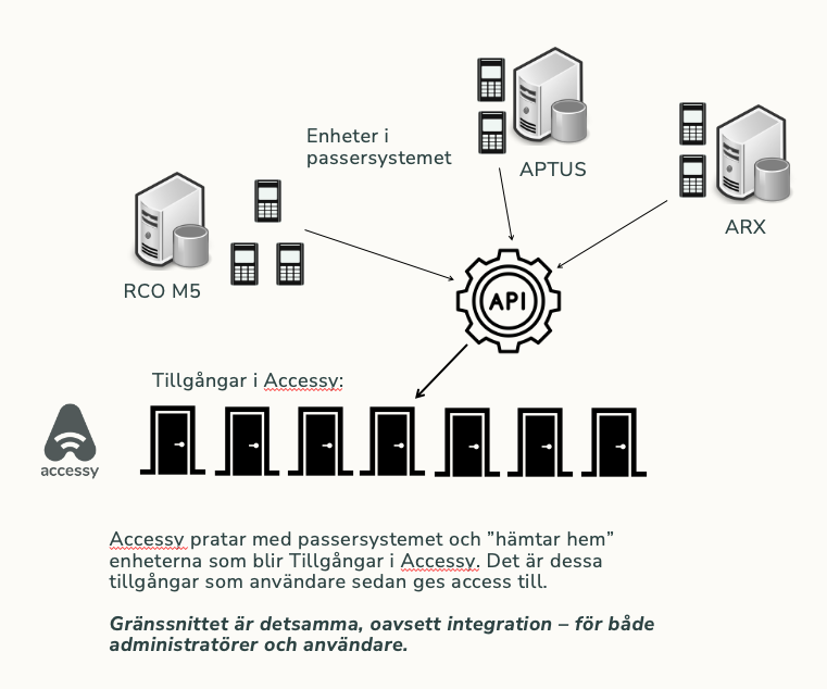 Accessy stöder integrationer mot flertal olika passersystem (se lista nedan). Via API integrerar vi direkt mot passersystemet och "hämtar hem" utvalda dörrar/enheter som sedan blir till "Tillgångar" i Accessy. På så sätt kan Accessy fungera som ett övergripande system för att hantera administration mot flera olika passersystem.