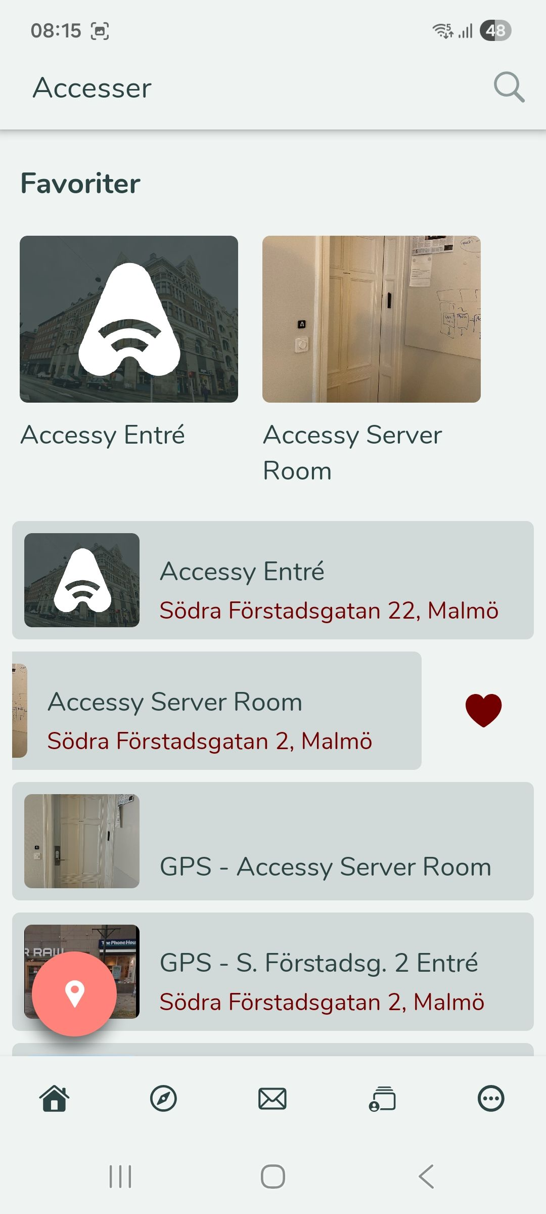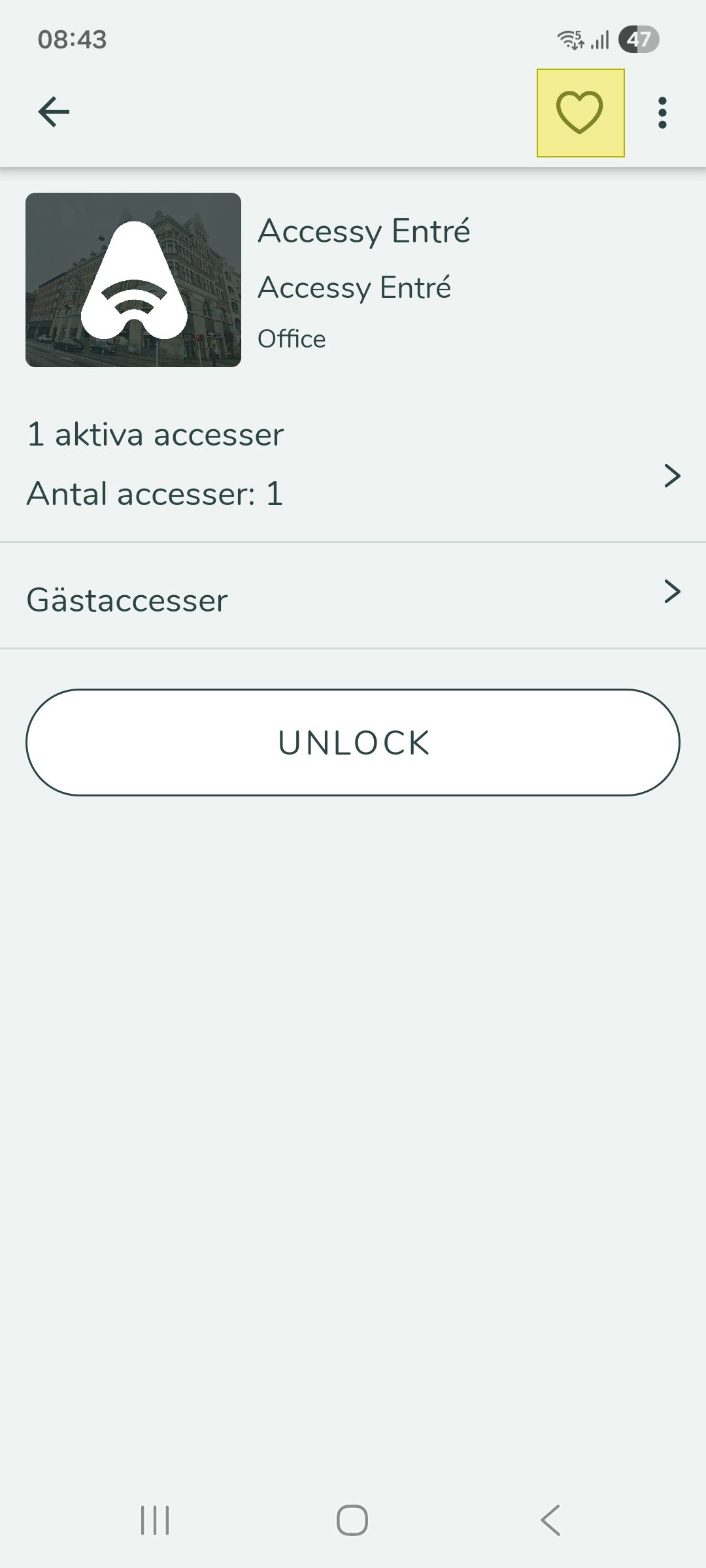 Att använda Accessy Att använda Accessy i vardagen för att låsa upp dörrar och rum är väldigt enkelt. Under "Mer" och "Accesser", hittar du de tilldelade accesser du har. Det finns två sätt att öppna en dörr på med Accessy: Via en knapp i appen, ...