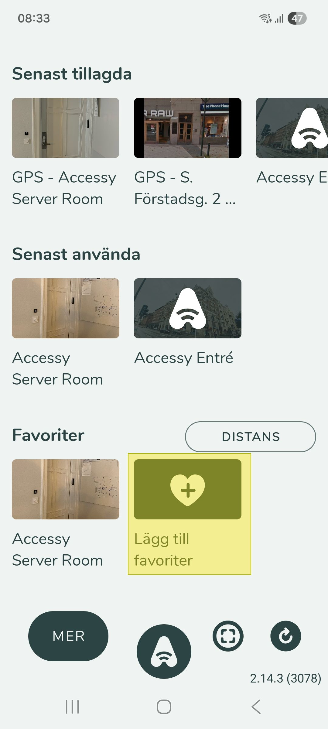 Man måste inte använda skanning. Tycker man det är enklare kan man istället lägga till en access som favorit och därigenom komma åt knappar för att öppna dörrar och portar med, istället för att skanna. Tryck helt enkelt på "Lägg till favoriter". Om ...